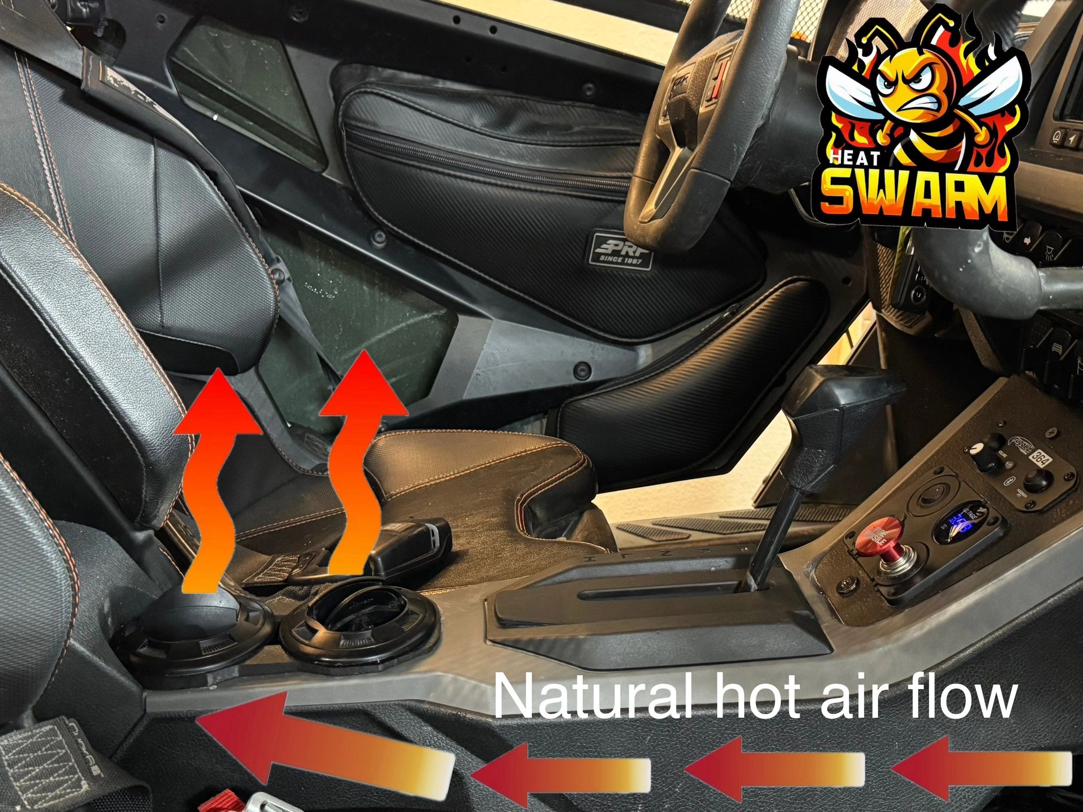 This is the first of its kind Heater Kit. It uses that pesky hot air that the RZR creates inside the center console when it’s moving (that makes drinks hot) and diverts it to these vents. It snaps right on and install takes a few seconds. It features injection molded Polaris vents